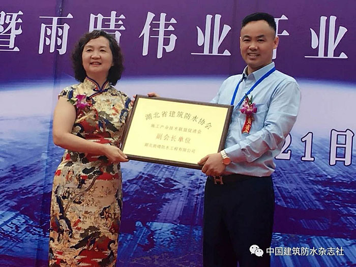 隨后,湖北防水協(xié)會會長桂春芳女士代表湖北防水協(xié)會在開業(yè)慶典大會上發(fā)表重要講話,她對湖北雨晴由最開始的施工企業(yè)轉(zhuǎn)型為防水系統(tǒng)服務(wù)商的工程進(jìn)行了簡要介紹,并對之前雨晴承接的眾多國家大型、重點(diǎn)項(xiàng)目的防水工程予以肯定,并對雨晴在湖北乃至華中地區(qū)較高知名度,美譽(yù)度,影響力予以了肯定。她還說:當(dāng)前,高質(zhì)量發(fā)展是新時代的要求,也是防水行業(yè)新時代的使命,并希望雨晴集團(tuán)在產(chǎn)品質(zhì)量、工程質(zhì)量和服務(wù)質(zhì)量的管理上進(jìn)一步做深做透做細(xì),日益精進(jìn)。心無旁騖造產(chǎn)品、一絲不茍干工程、全心全意做服務(wù),使雨晴集團(tuán)快速進(jìn)入高質(zhì)量高效益發(fā)展的康莊大道。之后授予雨晴公司“湖北省建筑防水協(xié)會施工產(chǎn)業(yè)技術(shù)聯(lián)盟促進(jìn)會副會長單位”。